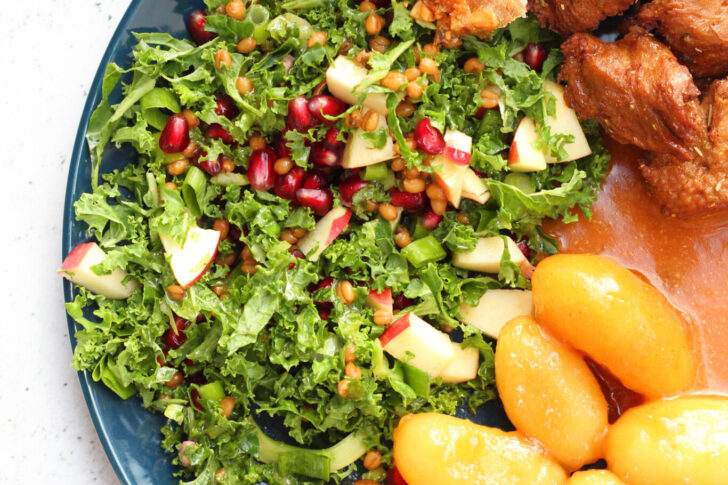 Lun linsesalat med grønkål, stegte kartofler og tranebær kan serveres…