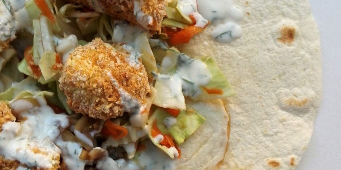 Jeg synes, at den sprøde hvidkålsslaw, det syrlige fra løgene og den panerede blomkål udgør en perfekt trio i en blød tortilla. Når der så også bliver hældt cremet lime-dressing oven på, så ved jeg snart ikke, hvad en pige ellers kan mangle. Jeg manglede i hvert fald ikke noget.